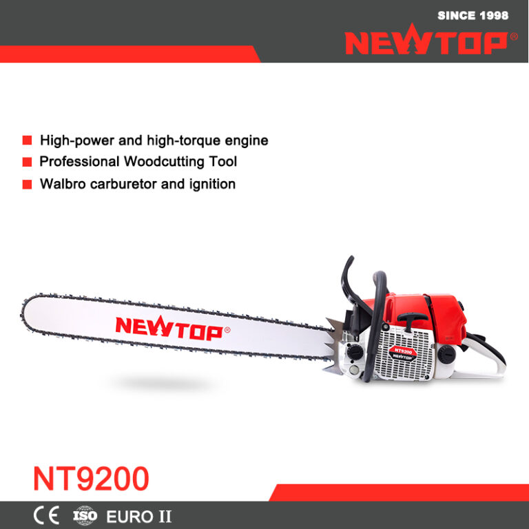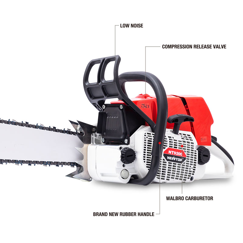 The NEWTOP Chainsaw NT9200 is built for professional loggers, offering advanced features for optimal outdoor performance. The Compression Release Valve makes starting easier, while the WALBRO Carburetor enhances engine efficiency and lifespan. The Brand New Rubber Handle reduces vibration, preventing hand numbness during long hours of use. With low noise, increased cutting efficiency, and improved handling, this chainsaw is the ideal equipment for tackling demanding outdoor tasks with power, comfort, and reliability.