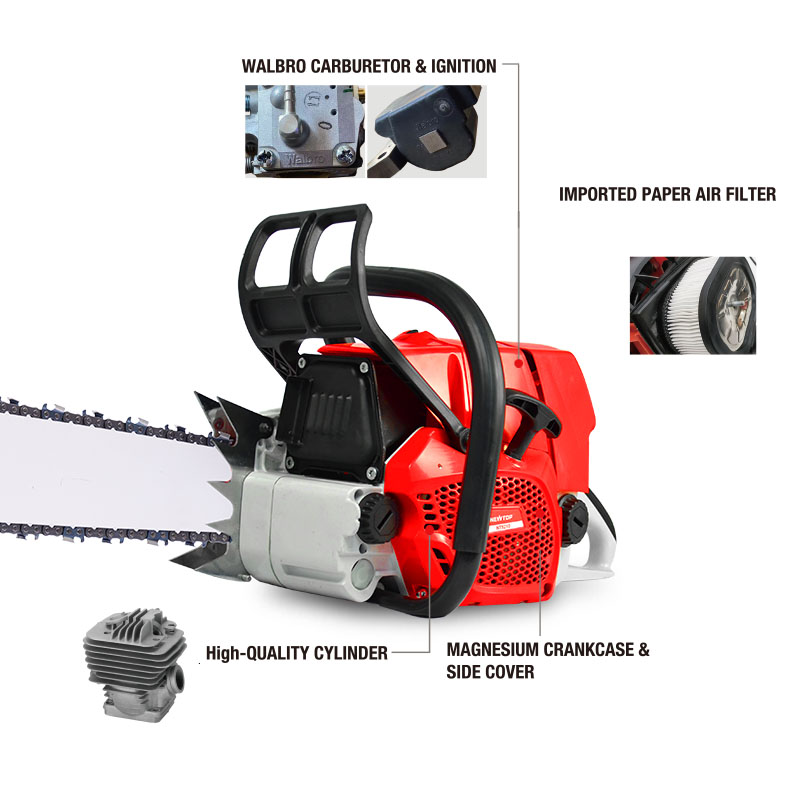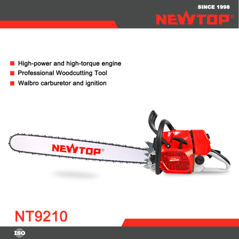The NEWTOP Chainsaw NT9210 is built for professional loggers, delivering high performance and advanced features. It has a WALBRO carburetor and ignition system for reliable starts and efficient fuel use, while the imported paper air filter boosts durability by 30%. The high-quality cylinder enhances stability, and the magnesium crankcase reduces weight by 1/3 for better handling. With 35% improved cutting efficiency, this chainsaw tackles tough tasks with ease.