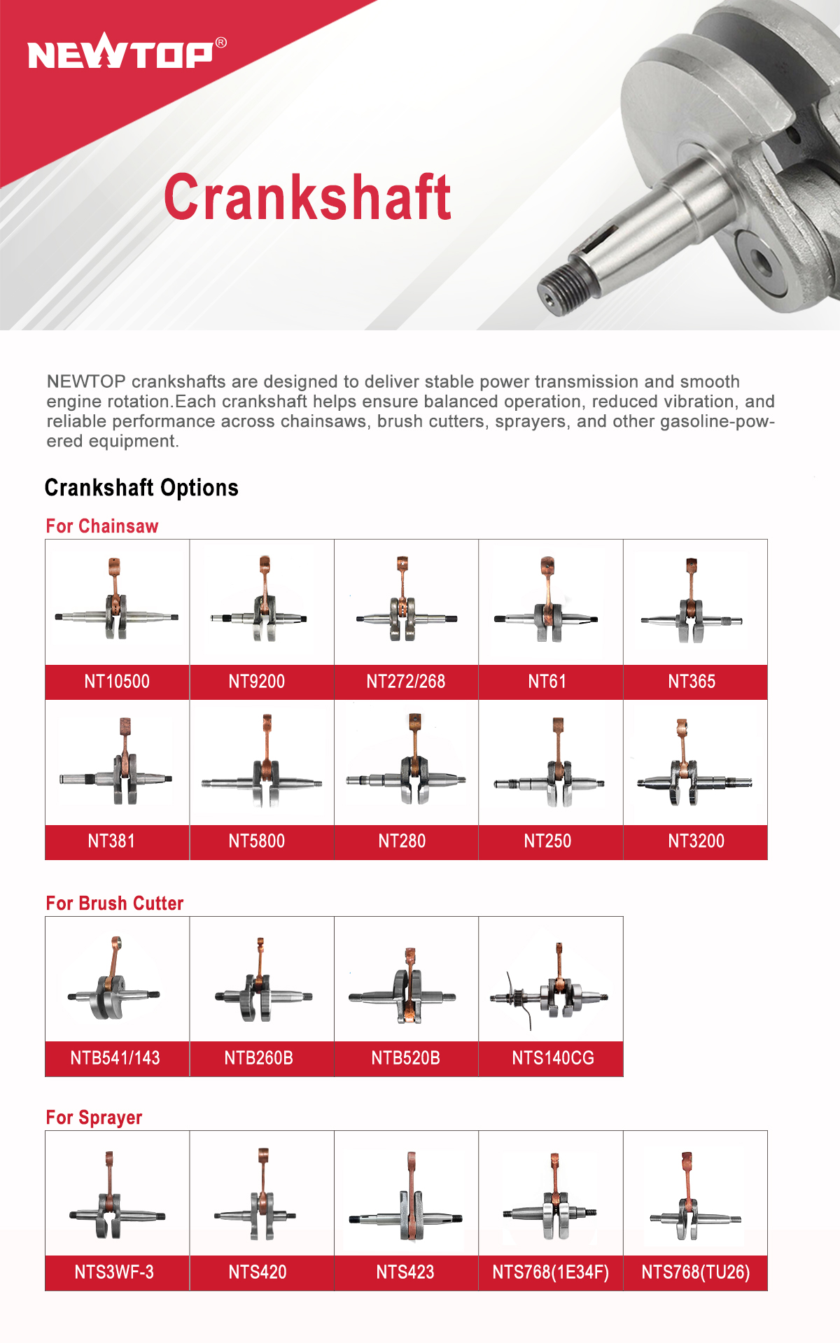 The NEWTOP Crankshaft is engineered to deliver stable rotation and reliable engine performance across a wide range of gasoline-powered equipment, including chainsaws, brush cutters, sprayers, and similar machines.