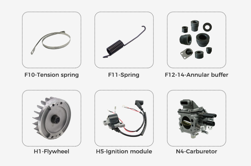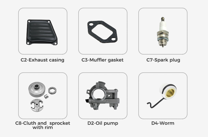 Paired with a Walbro-process carburetor, the system maintains excellent fuel efficiency and throttle response. The German-alloy saw chain and hardened steel guide bar ensure superior cutting speed and durability—making this parts set a long-lasting and cost-effective replacement solution for professional forestry, construction, and agricultural applications.