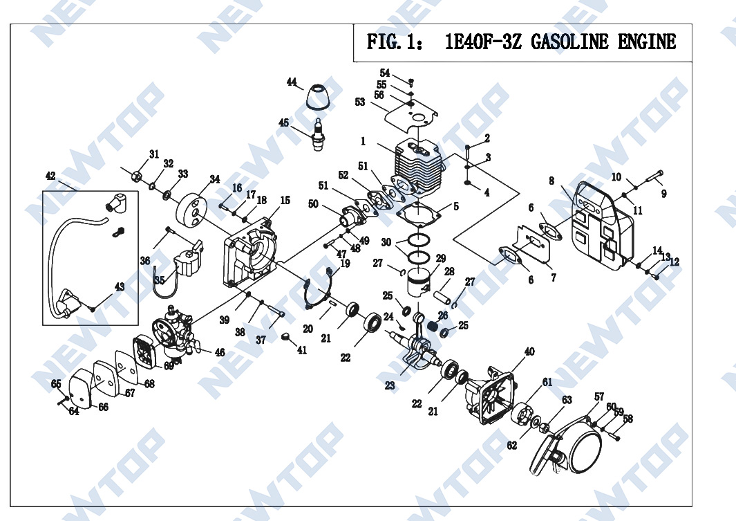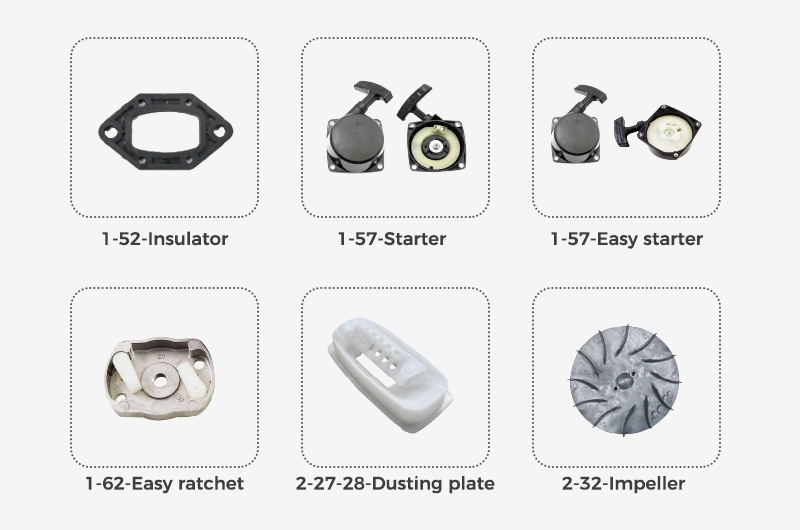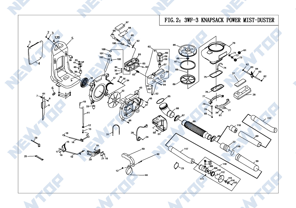 The NEWTOP NTS3WF-3 Sprayer Parts Set provides a comprehensive selection of high-quality components, including engine assemblies (cylinders, pistons, crankshafts, mufflers, coils), fuel system assemblies (tanks, tubes, filters), and misting units (impellers, nozzles, dusting plates, hoses, switches). Every part is crafted to meet or exceed the standards of the original equipment, ensuring smooth operation and consistent output.
