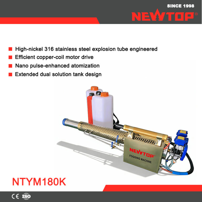 The NEWTOP Thermal Fogger NTYM180K is a high-capacity thermal fogging machine designed for continuous large-area fogging with enhanced durability and strong output stability. With a reinforced stainless-steel heating system, high-efficiency electrical architecture, and extended solution capacity, this Thermal Fogger delivers sustained fog volume, long spraying reach, and reliable performance for intensive sanitation and pest control operations.