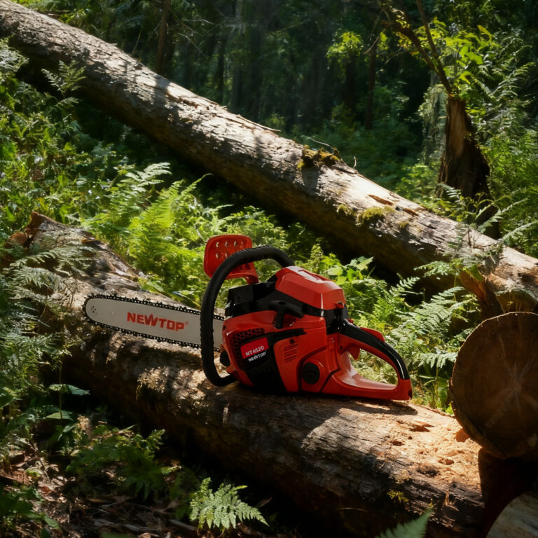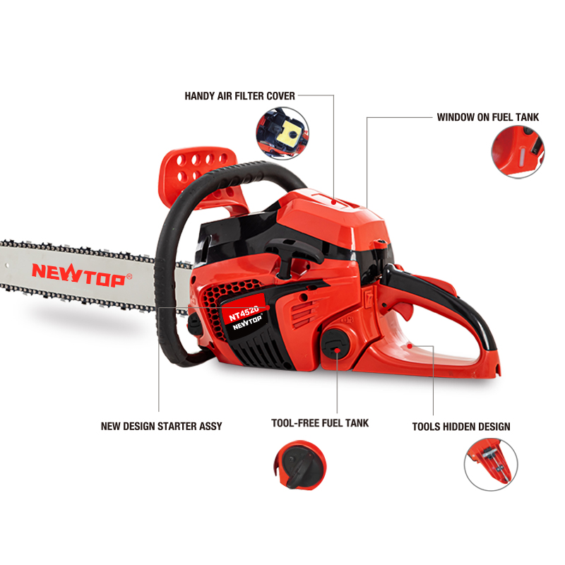 The NEWTOP Chainsaw NT4520 combines innovation and practicality for efficient outdoor cutting. It features a handy air filter cover for better cooling, a visible fuel window for quick checks, and a tool-free tank design for convenience. With low vibration and excellent damping, it offers smoother operation and less fatigue—perfect for tree maintenance and timber logging.