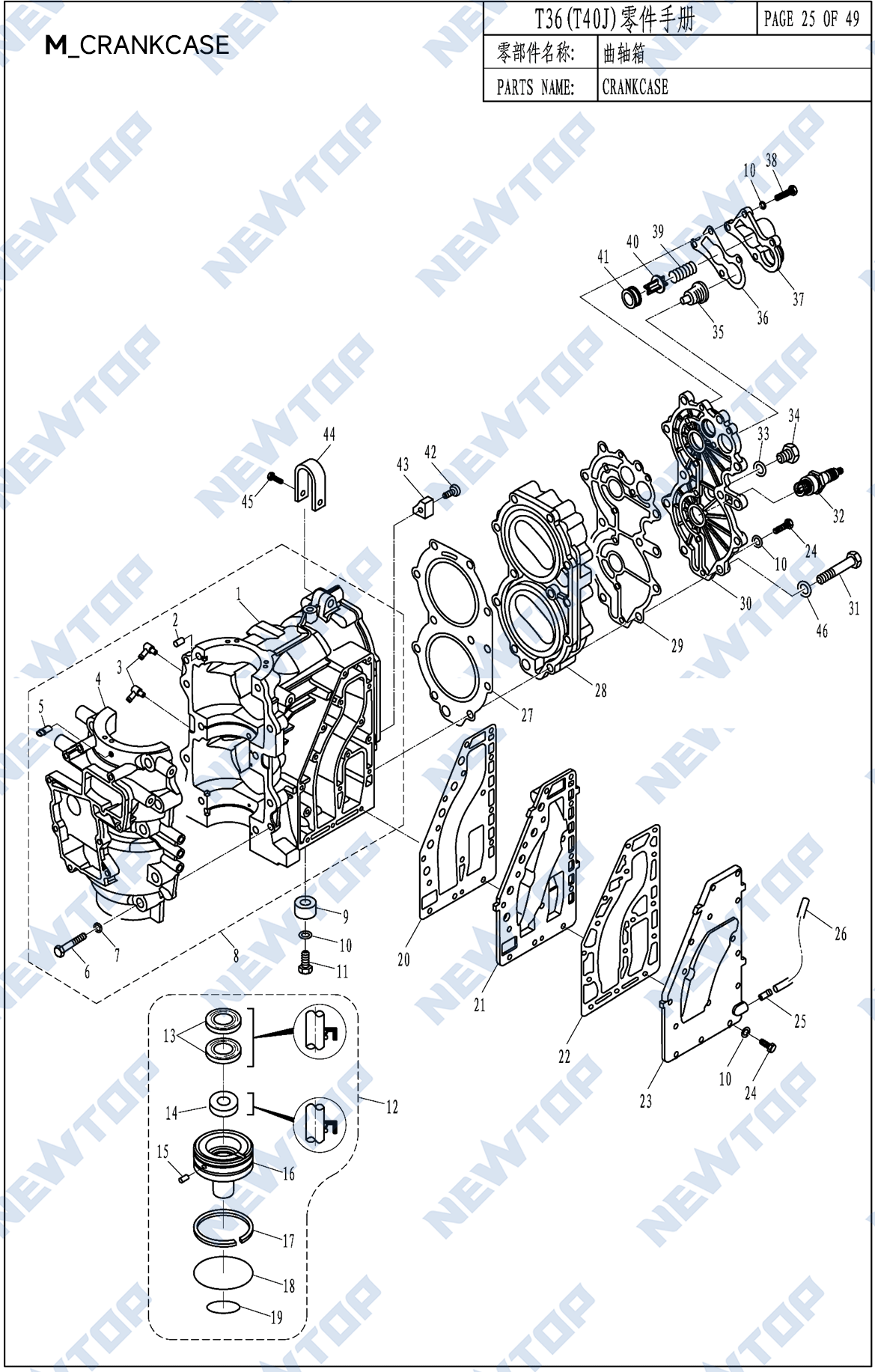 The T40J/T40G Outboard Motor Parts Set from NEWTOP is designed to keep 40HP engines performing with dependable torque and smooth operation. Its major assemblies—crankshaft parts, gear case, piston components, and cylinder structure—are produced with strict machining standards to help the engine run consistently even during prolonged use.