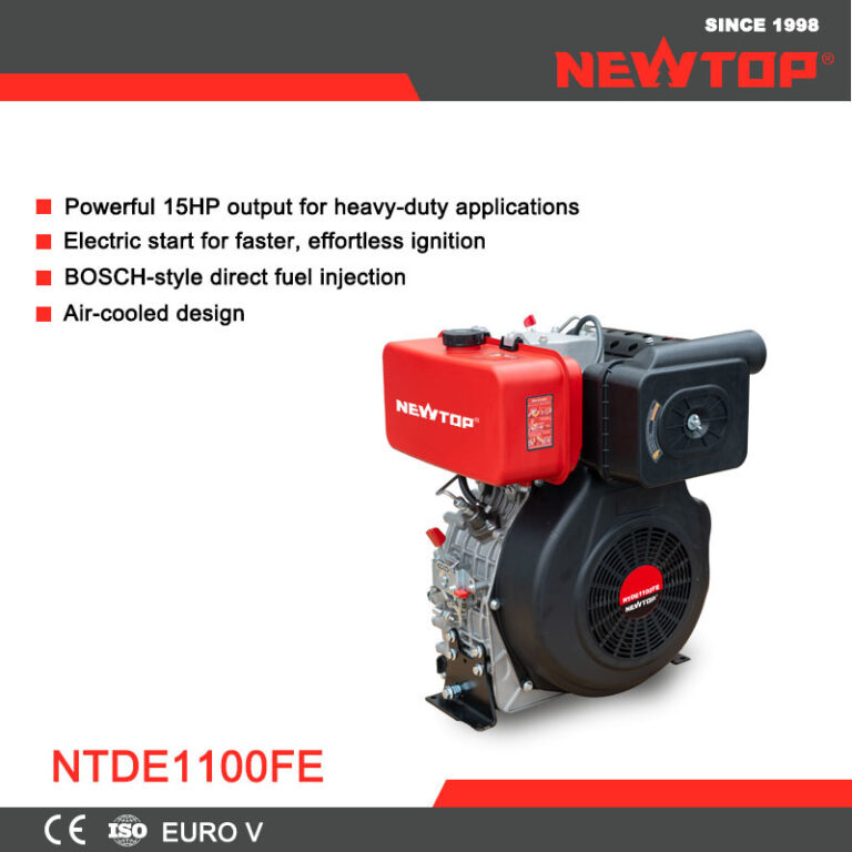 The NEWTOP NTDE1100FE represents the next level of diesel power — combining 15HP high output with electric-start convenience. Designed for high-demand operations, it delivers steady torque, long-lasting performance, and fuel-efficient operation across agriculture, construction, and industrial use.
