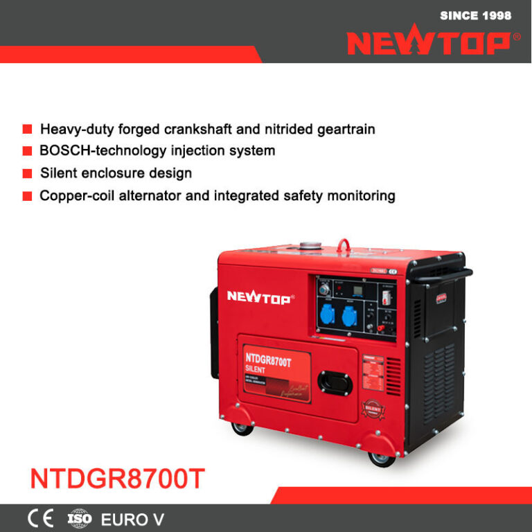 Featuring a high-capacity diesel engine built with NEWTOP’s forged 42CrMo crankshaft and nitrided gear structure, the NTDGR8700T offers excellent durability for high-load equipment. Its BOSCH-technology fuel-injection system ensures precise fuel delivery, contributing to improved combustion efficiency and stable output during long intervals of use. This robust mechanical foundation makes the unit suitable for construction and field service applications.