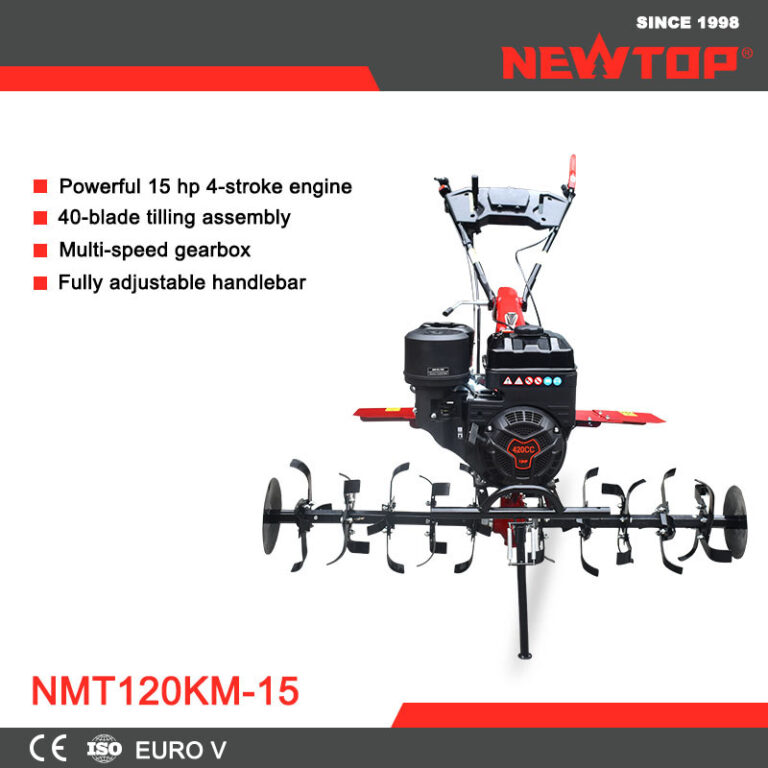 The NEWTOP Tiller Cultivator NMT120KM-15 delivers high power and wide working coverage for demanding soil preparation tasks, offering a reliable choice for farmers and professional users who require strong performance in tough field conditions.