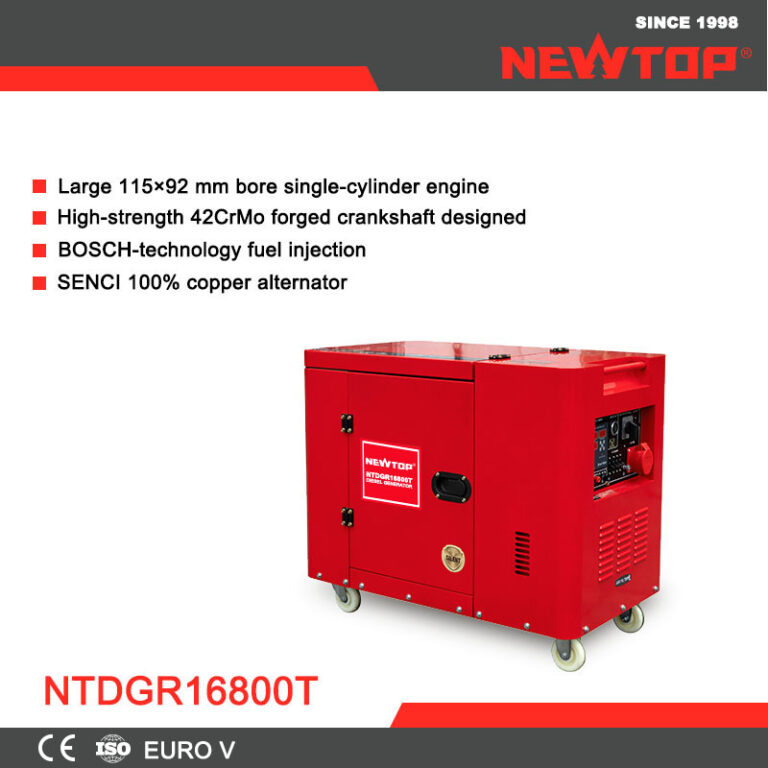 The NEWTOP Silent High-Power Diesel Generator NTDGR16800T is engineered for tough applications requiring larger displacement and higher power delivery. Its 115 mm bore engine combines forged-steel construction with BOSCH-technology injection to maintain smooth operation and efficient fuel use.