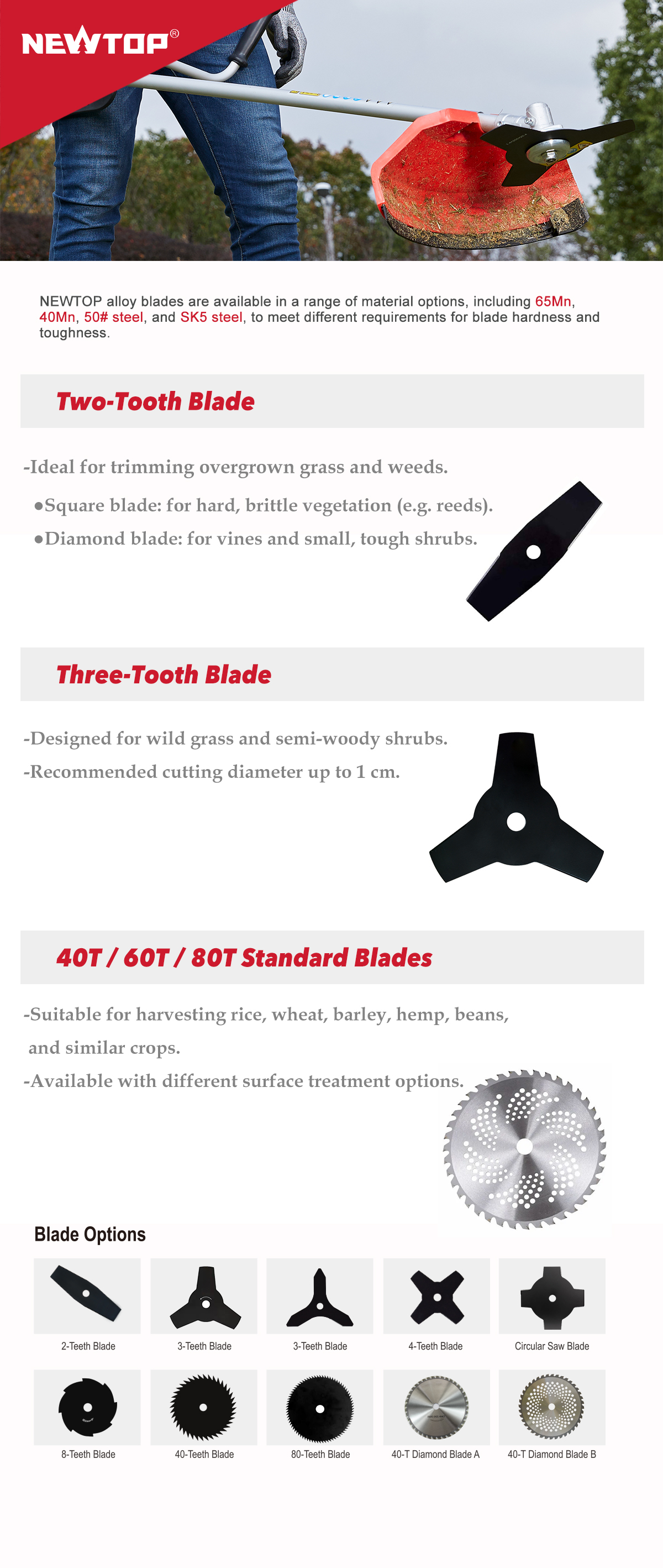 With a combination of engineered material selection, controlled heat-treatment, and fine machining, the NEWTOP Brush Cutter Blade offers sharpness, durability, and cutting stability—providing users with dependable performance across routine and demanding outdoor clearing tasks.