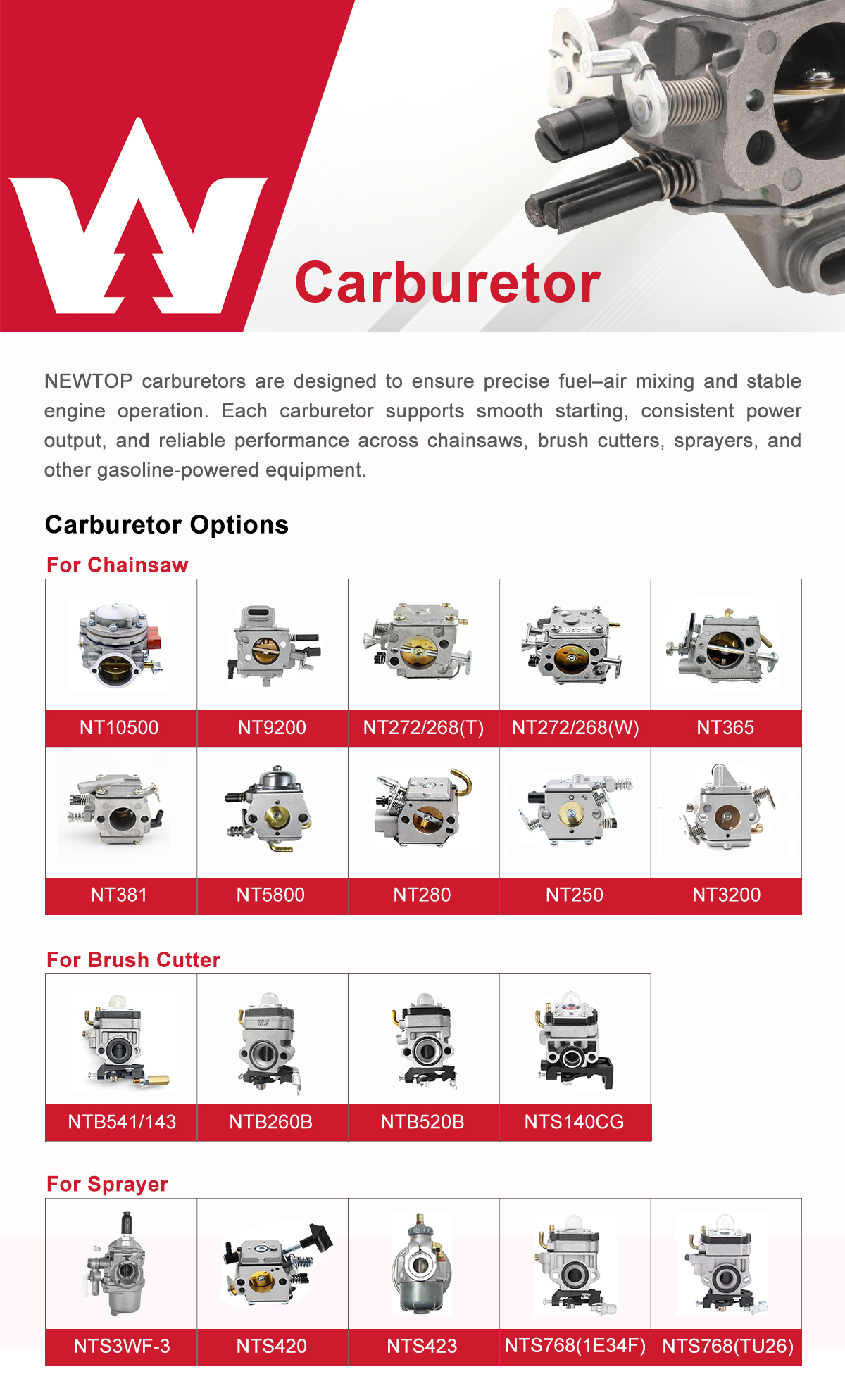The NEWTOP Carburetor delivers consistent fuel supply and stable engine response for gasoline-powered equipment, including chainsaws, brush cutters and sprayers.Built with a reliable carburetor body, precision-machined components, and high-quality diaphragms, it supports smooth operation under varied working conditions.